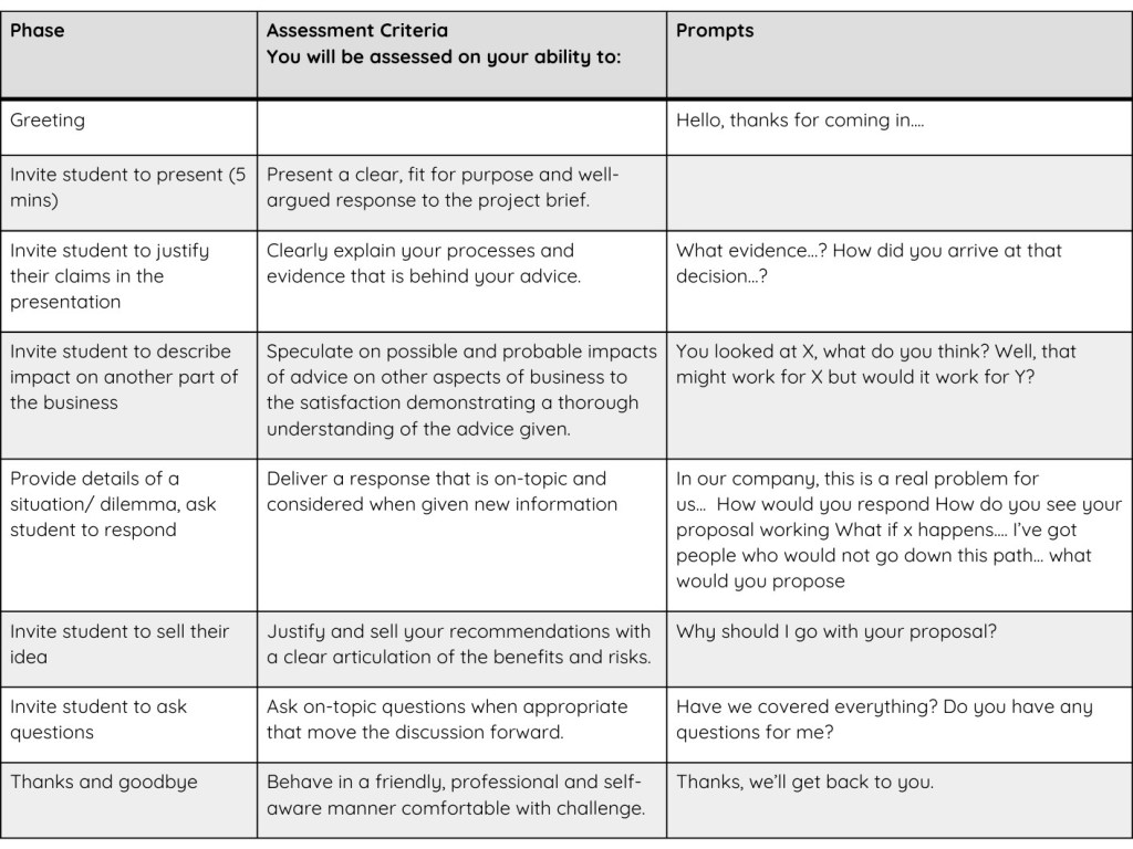 Unlike marking rubrics for other assessment types, the IOA marking rubric serves another important purpose – it is used by the assessor as a scaffold for the conversation so that the conversational experience is consistent for all students.
