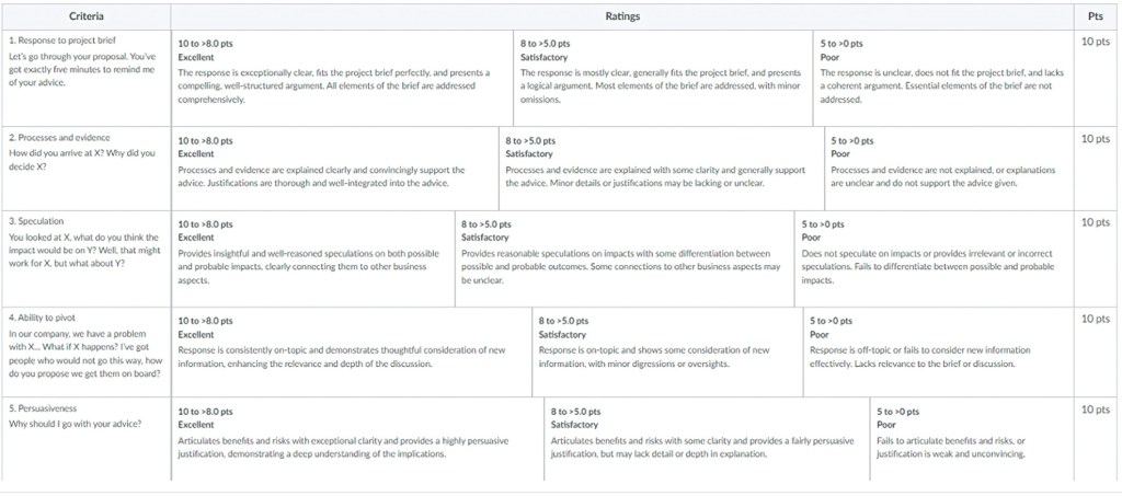 We recommend that the rubric be implemented digitally in your learning management system, so marks and feedback can be added for each student in the marking time allotted for each IOA session. See the screenshot below of how the first five criteria displayed in the Canvas LMS.